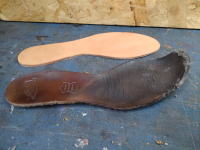 ソールを外した状態でサイズを整えた木型を挿入します。左が挿入前、右が挿入後。つま先の反り上がりを戻しています。